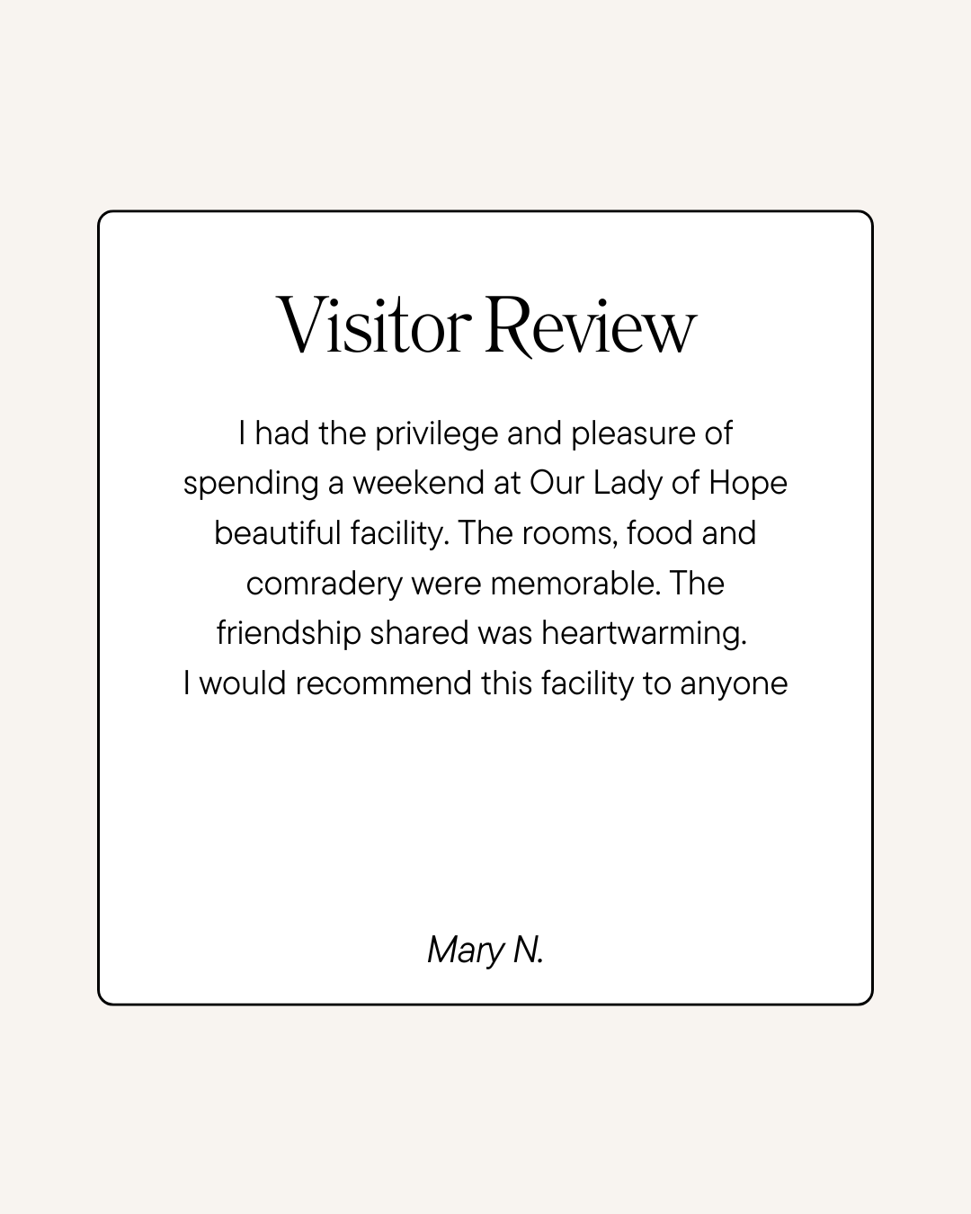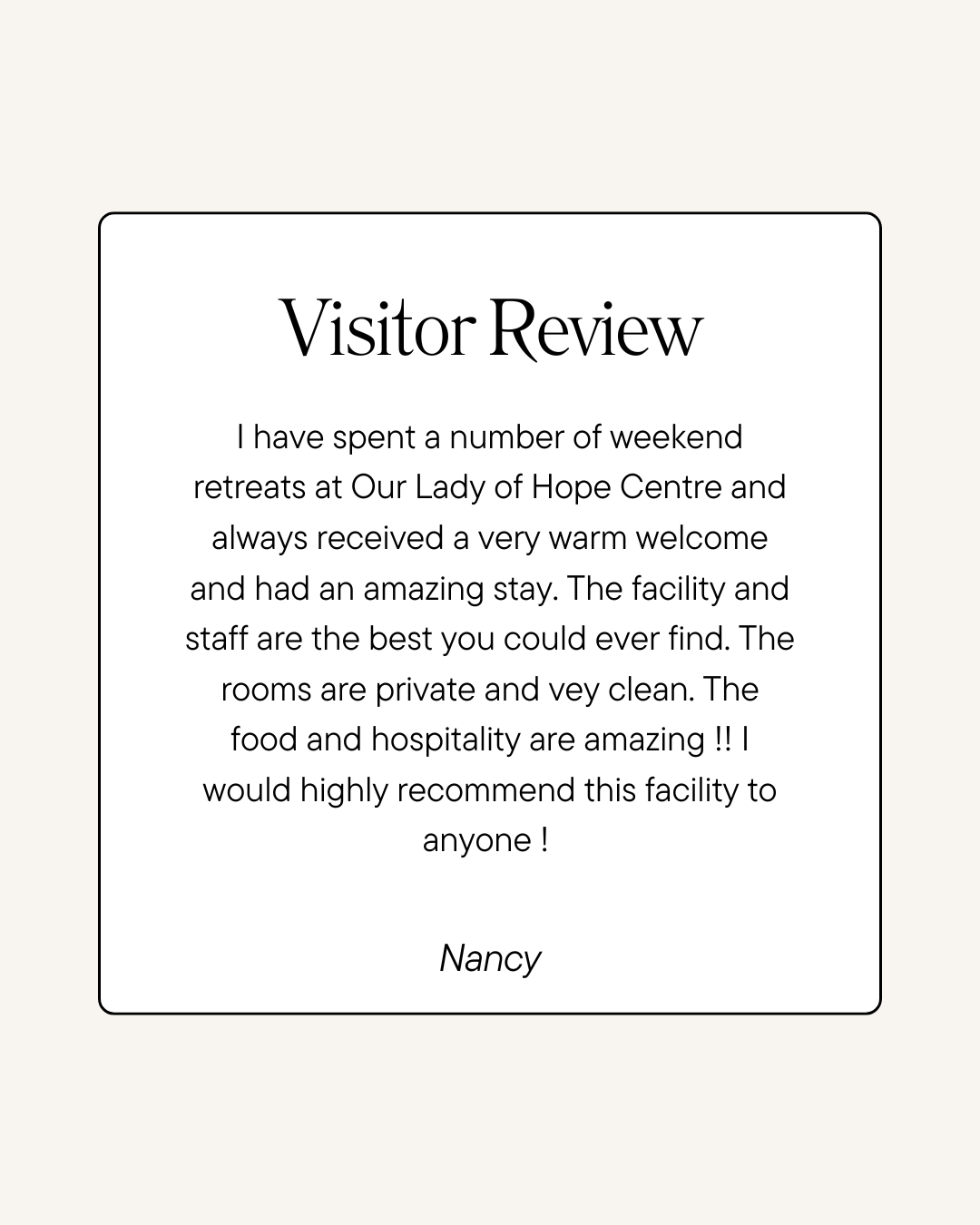 We are grateful to all who have spent time with us at Our Lady of Hope Retreat Centre. Your kind words and reflections mean so much to our community and help others discover this peaceful place of prayer, rest, and renewal. We invite you to read the experiences shared below—and if you have stayed with us, we would be honoured if you would leave a review and share your own journey with us.